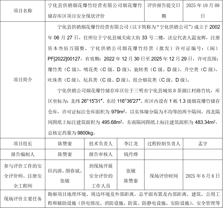 宁化县供销烟花爆竹经营有限公司烟花爆竹储存库区项目安全现状评价