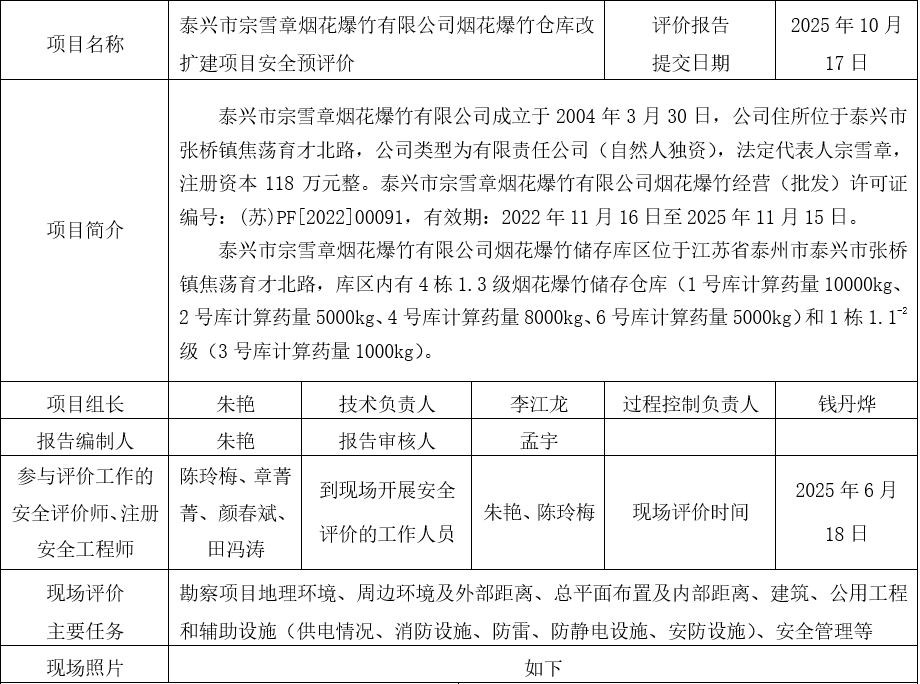 泰兴市宗雪章烟花爆竹有限公司烟花爆竹仓库改扩建项目安全预评价