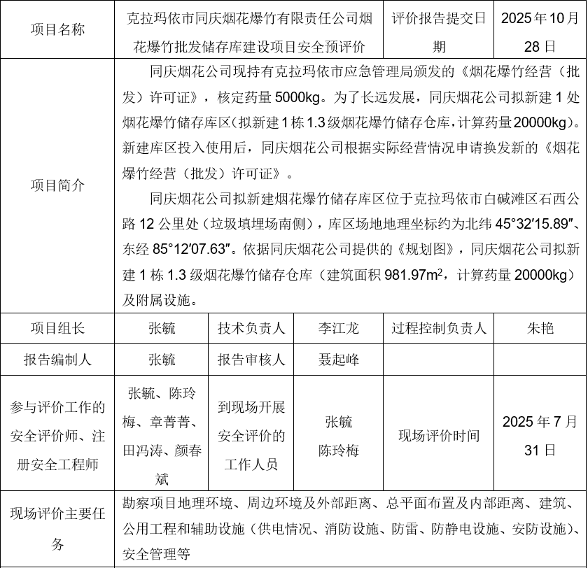 克拉玛依市同庆烟花爆竹有限责任公司烟花爆竹批发储存库建设项目安全预评价