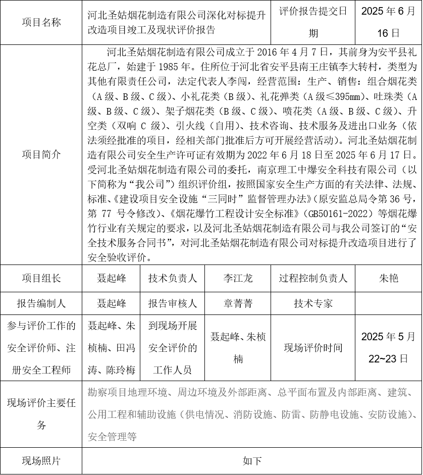 河北圣姑烟花制造有限公司深化对标提升改造项目竣工及现状评价