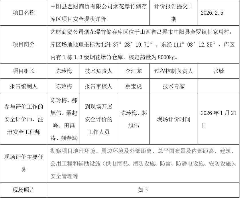 中阳县艺财商贸有限公司烟花爆竹储存库区项目安全现状评价