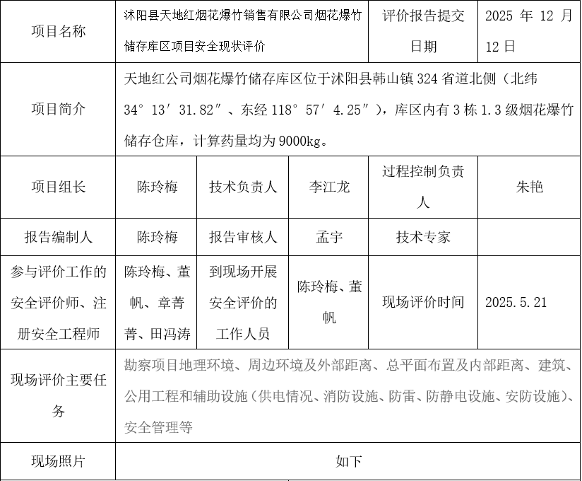 沭阳县天地红烟花爆竹销售有限公司烟花爆竹储存库区项目安全现状评价