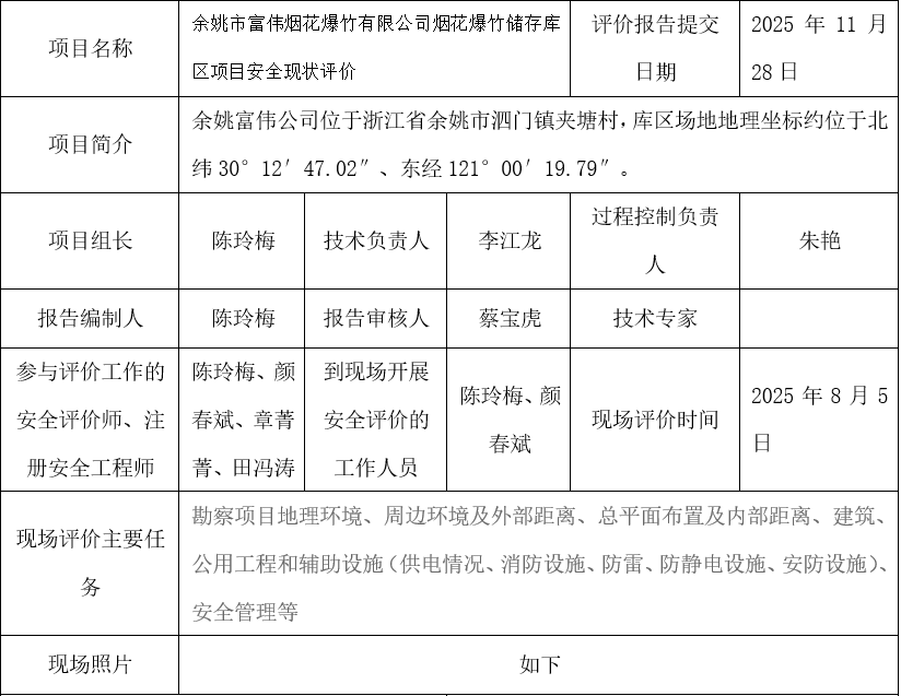 余姚市富伟烟花爆竹有限公司烟花爆竹储存库区项目安全现状评价