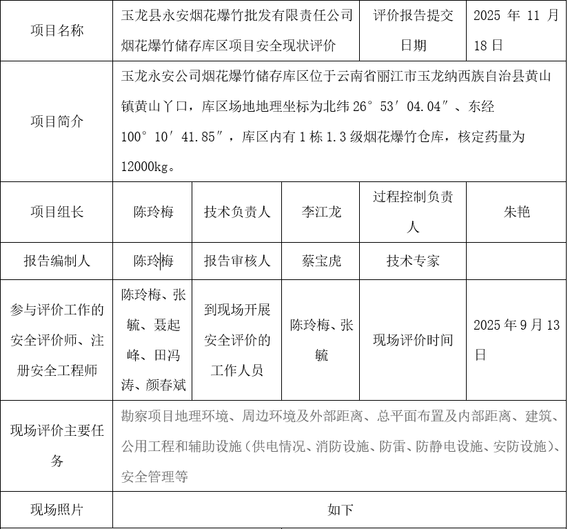 玉龙县永安烟花爆竹批发有限责任公司烟花爆竹储存库区项目安全现状评价