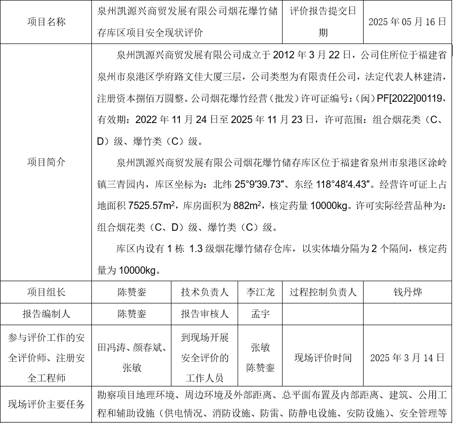 泉州凯源兴商贸发展有限公司烟花爆竹储存库区项目安全现状评价