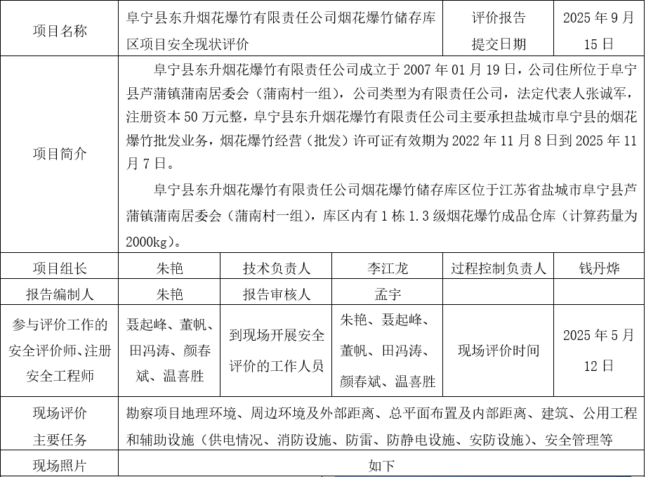 阜宁县东升烟花爆竹有限责任公司烟花爆竹储存库区项目安全现状评价