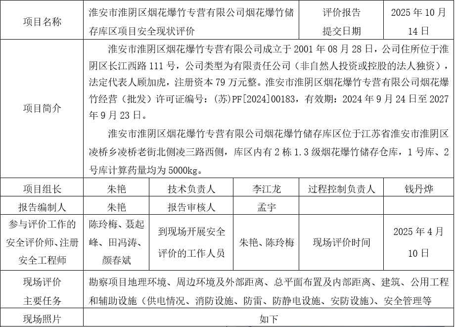 淮安市淮阴区烟花爆竹专营有限公司烟花爆竹储存库区项目安全现状评价