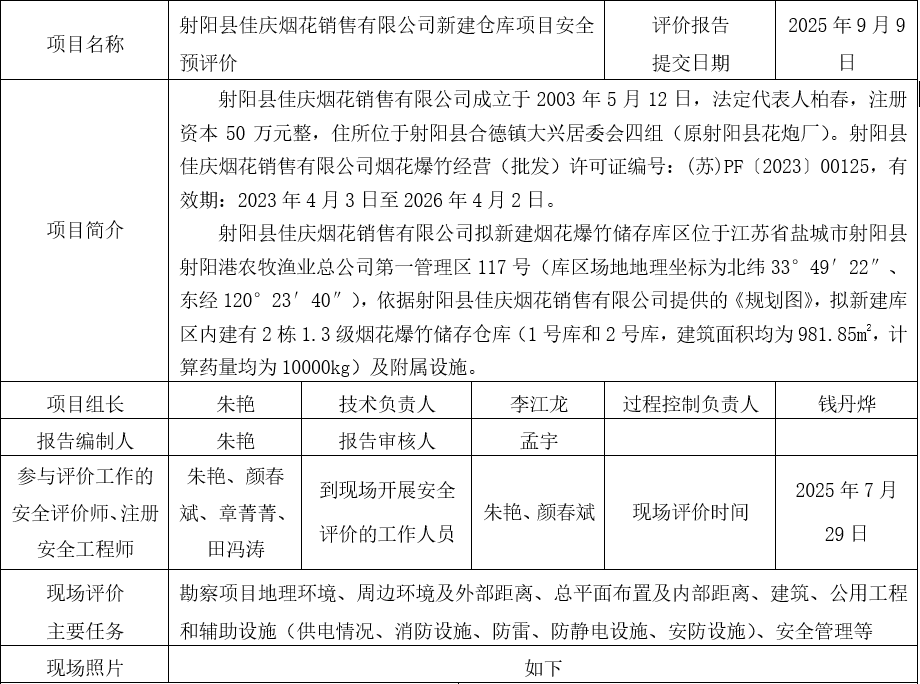 射阳县佳庆烟花销售有限公司新建仓库项目安全预评价