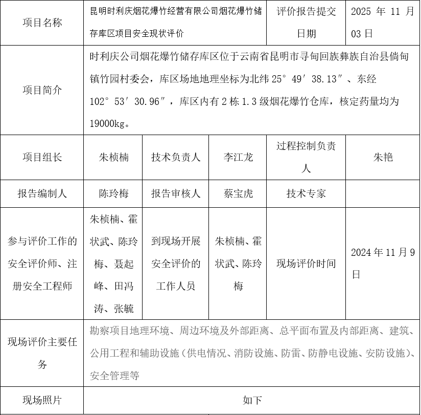 昆明时利庆烟花爆竹经营有限公司烟花爆竹储存库区项目安全现状评价