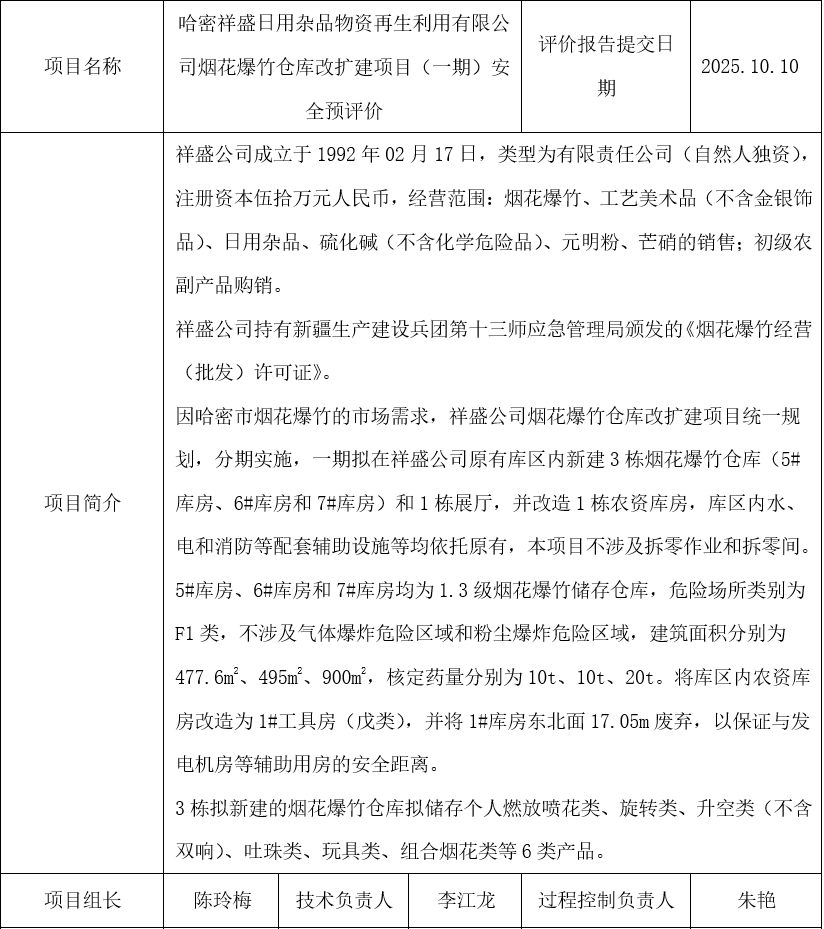 哈密祥盛日用杂品物资再生利用有限公司烟花爆竹仓库改扩建项目(一期)安全预评价