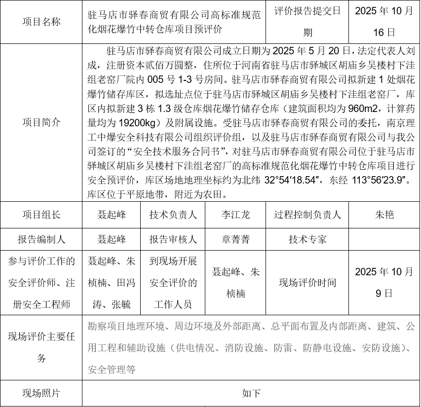 驻马店市驿春商贸有限公司高标准规范化烟花爆竹中转仓库项目预评价